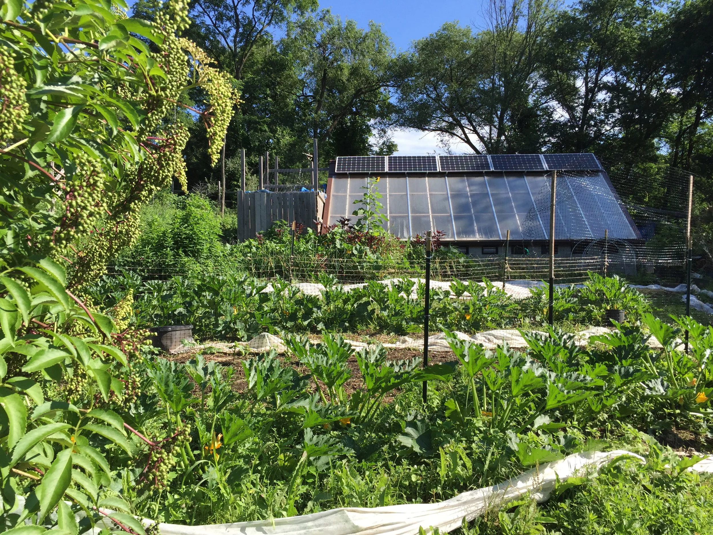 from 2008 to 2012 we worked to grow as much soil as possible on two small annual garden plots while we waited for our fruit trees to come into fruit bearing age. Then, in 2013 we moved onto the largest section of the farm and began building our bioshelter. The bioshelter is the hub of the farm, where we grow all of our seedlings, housing our chickens, and growing food through the winter. A bioshelter is an ecologically designed greenhouse, using simple but effective technology to keep the building warm and productive. Within our bioshelter we manage a small tropical food forest including passion fruit, guava, banana, citrus, pomegranate, and more. The design of the bioshelter was a team project led by John Creasy with much guidance from Darrell Frey, author of the Bioshelter Market Garden.