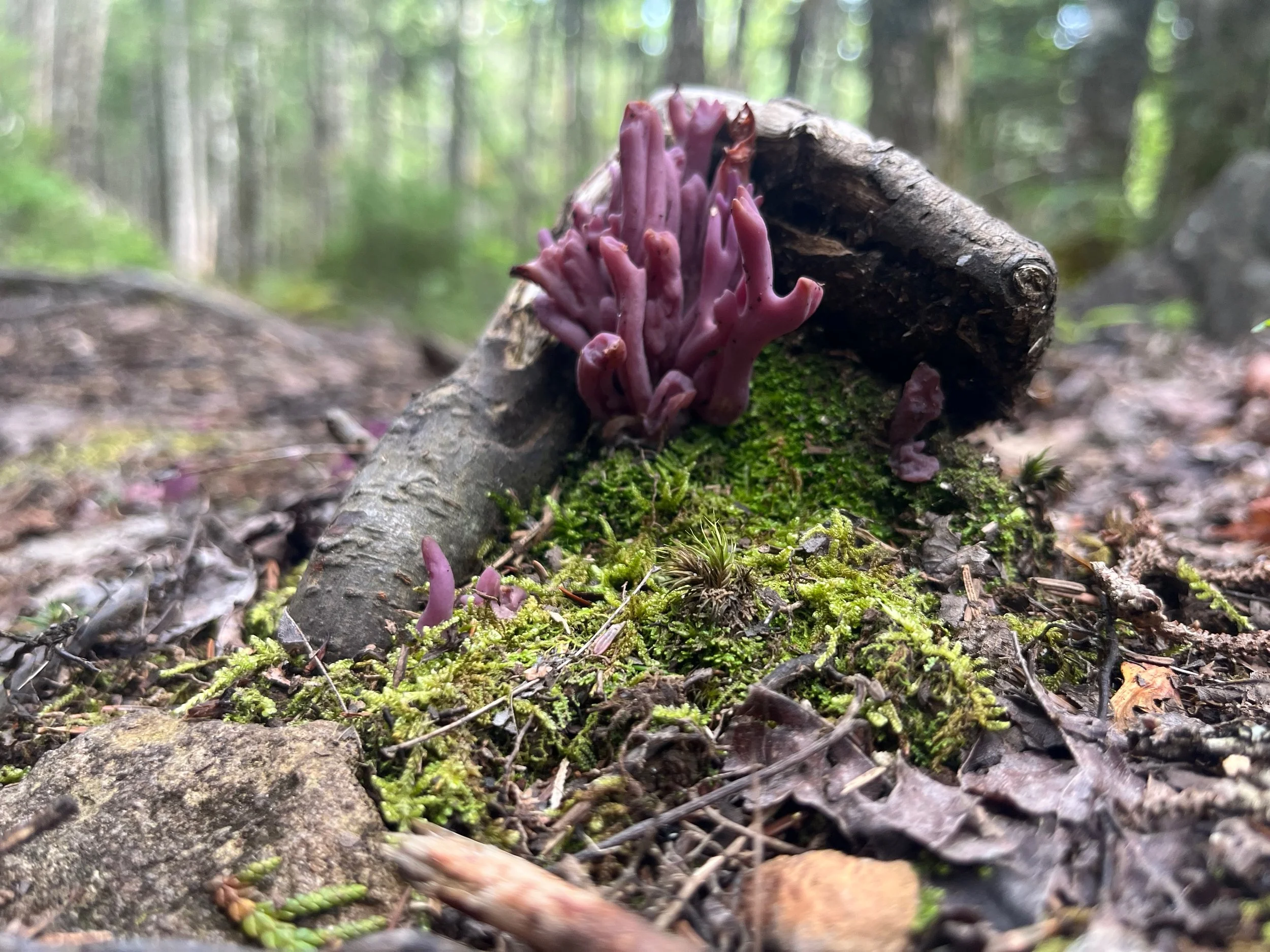 Caption: Violet coral, a species of Clavarioid fungi, pokes through some moss from underneath a tree root in north central Pennsylvania.
