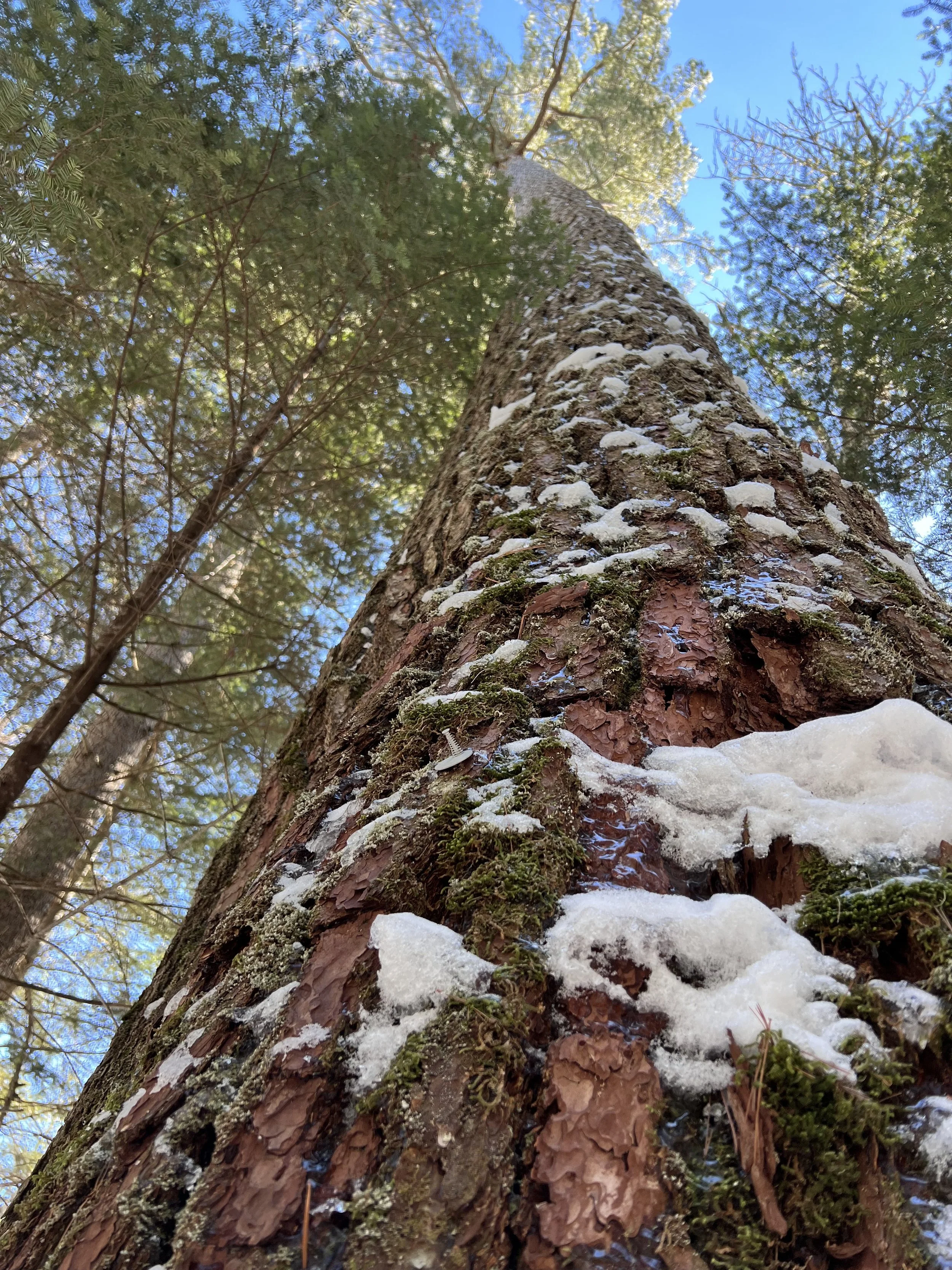 Finding your way toward the Elder Grove is a bit of a strange experience. The forest doesn’t feel old as you make your way toward the pin on your GPS map. Its not until you’re nearly in the grove that you feel transported to a different time and place. Suddenly the forest floor feels thick with moss and fungal duff. The trees aren’t as big as redwoods, but they reach so high into the sky, towering over the red spruce and Frasier fur in the understory. Each old growth white pine is about the same age, just over 400 years old. They’re all reaching their maximum age limit, like a human hitting 99 or 100, these trees have lived long and healthy lives, but can’t live on forever. Most will fall in wind storms like 103. Several of the tallest trees have come down over the past five years. But not all of them.